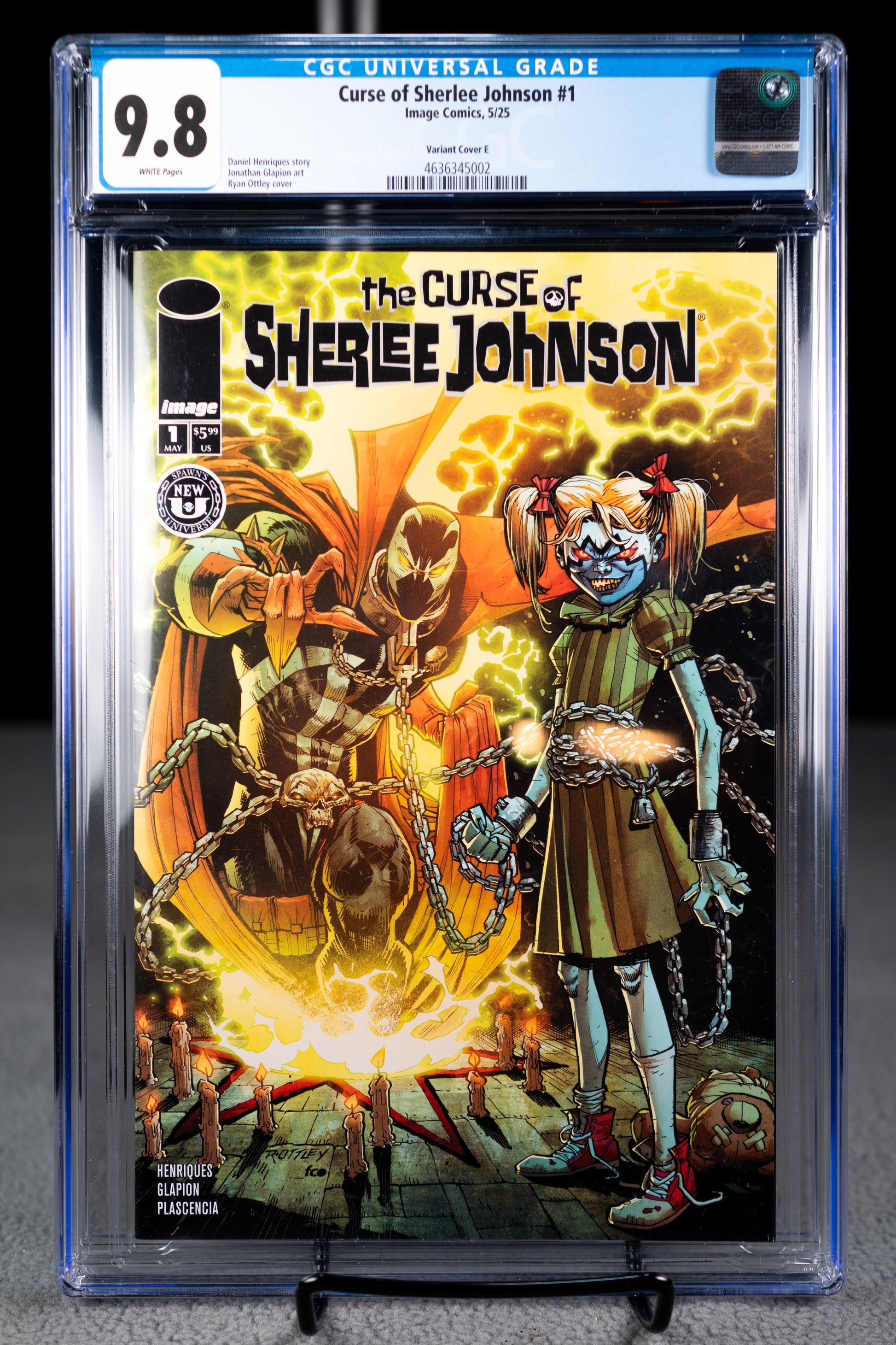 The Curse of Sherlee Johnson #1 1:50 Ryan Ottley variant Cover E CGC 9.8, a rare Spawn Universe incentive showcasing Ottley’s bold and dynamic artwork. This high-ratio slabbed edition is prized for its exclusivity and pristine grade. Inside, the debut issue introduces Sherlee Johnson into the expanding Spawn Universe, deepening the mythology of Todd McFarlane’s iconic world.