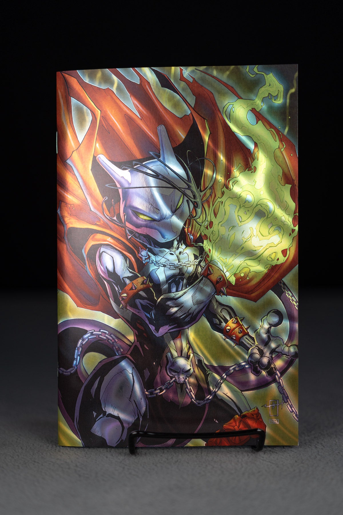 Spawn meets Pokémon in this wildly imaginative Spawnized Mewtwo lava foil variant by Jonathan Uribe.